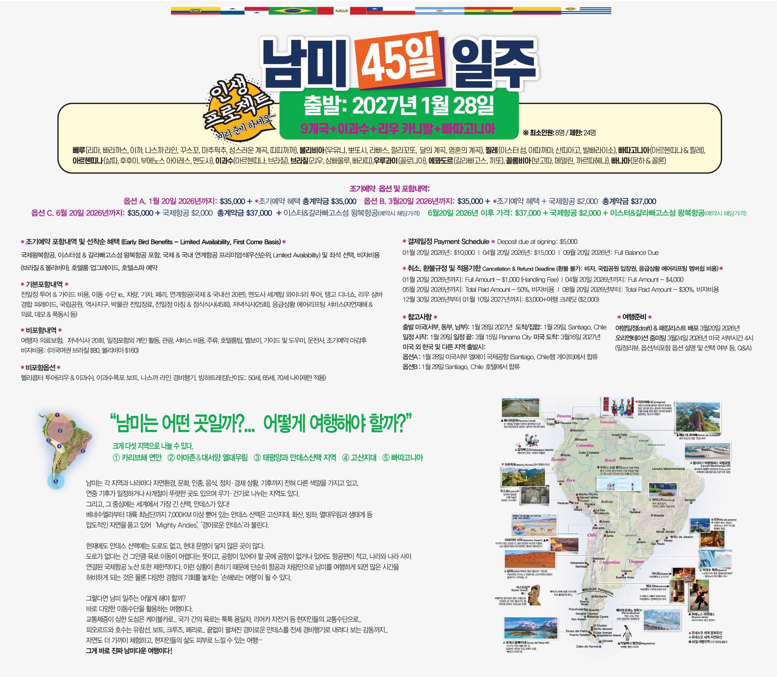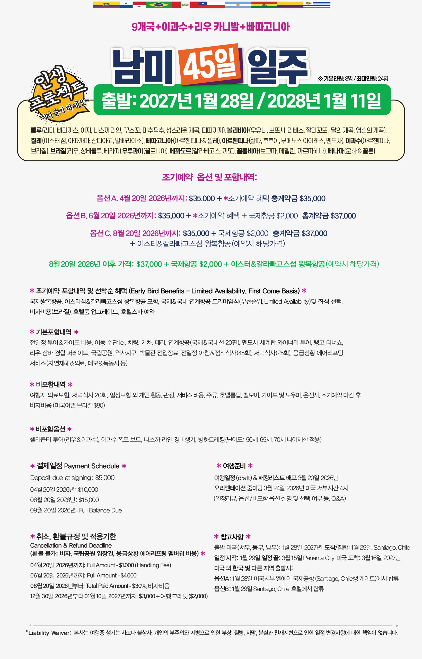 2026년: 1월24일 (얼리버드 마감)/ 2월10일/ 11월10일/ 12월 16일 $8,500+항공