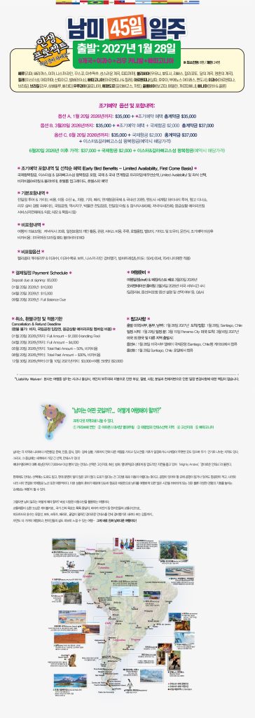 2026년 4월21일/9월20일 $7,600+항공 (얼리버드)