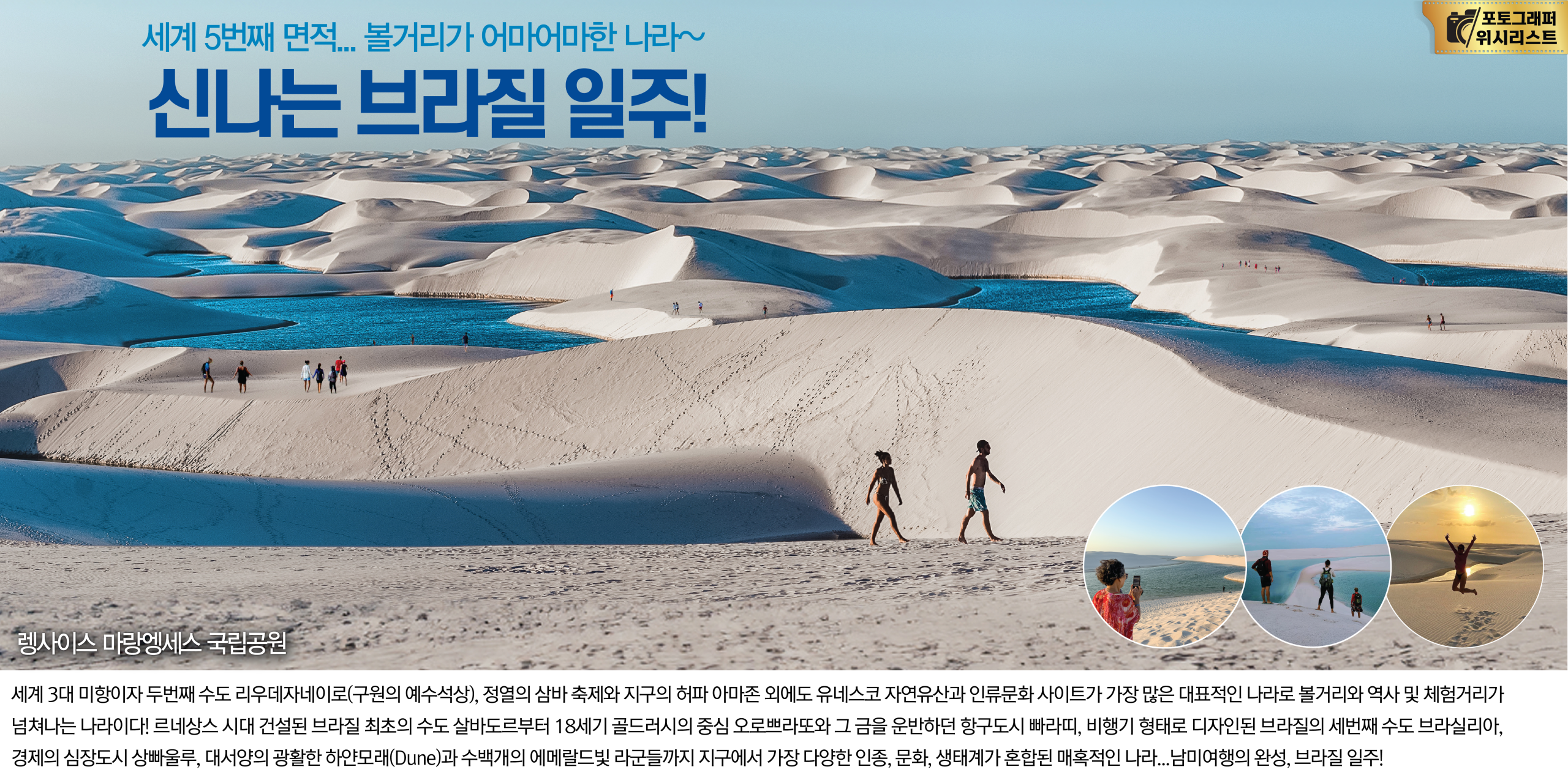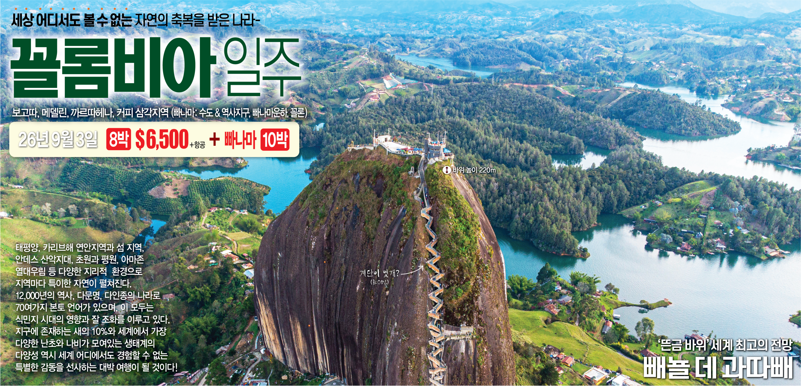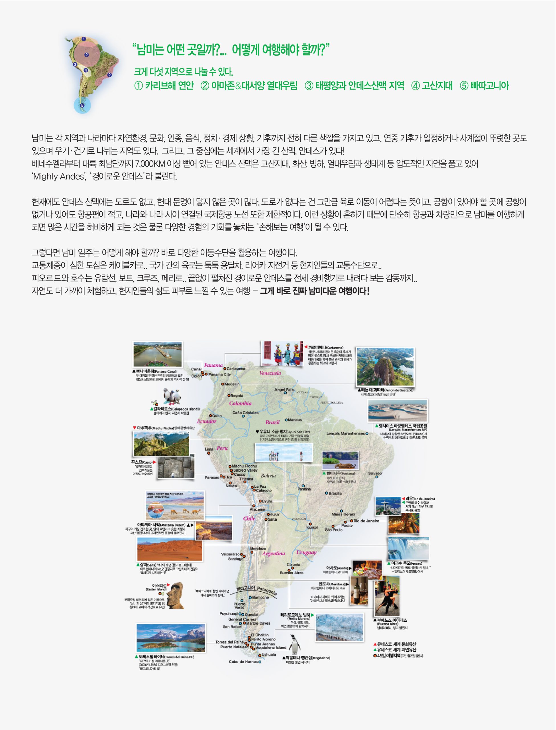 볼리비아: 우유니, 잉까우아시섬, 기차무덤, 뚜루삐사, 라빠스, 뽀또시, 달의 계곡, 영혼의 계곡, 마녀시장, 미뗄레페리꼬(케이블카) 12노선으로 공중 시티투어 아르헨띠나: 살따, 똘라르 그란데, 뿌르마마르까, 후후이, 우마우아까, 14색산 찔레: 아따까마, 달의 계곡, 아따까마 소금평지, 안데스 플라밍고 보호지대, 발띠나체스 호수, 붉은바위 호수 뻬루:꾸스꼬, 마추픽추, 성스러운 계곡, 무지개산 등반, 띠띠까까 호수, 리마(신&구시가지), 미쉘린 니께이 요리 1회, 라르꼬 박물관, 빠라까스, 나스까 경비행기(옵션)