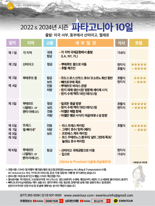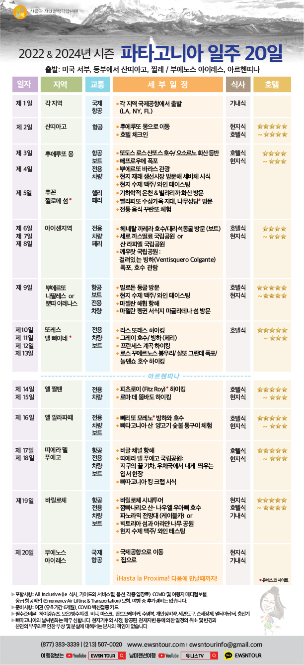 출발: 미국 서부, 동부-> 산티아고, 칠레 / 부에노스 아이레스, 아르헨티나